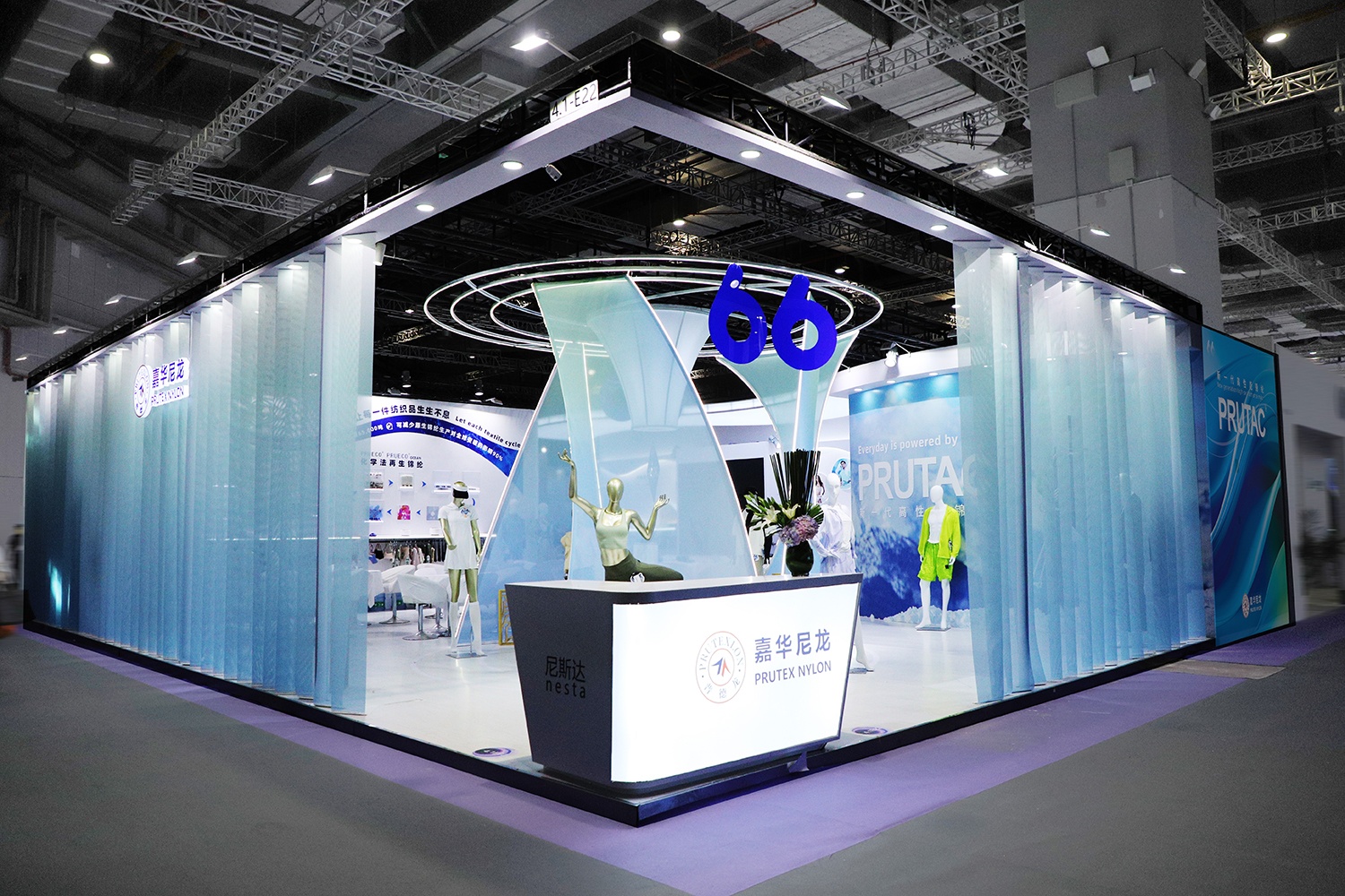 嘉華尼龍本次展臺(tái)以上古神獸-鳳凰的五彩羽毛為靈感,旨在通過絲縷重疊、通透玲瓏的展臺(tái),呈現(xiàn)如鳳羽般舒適、輕量、強(qiáng)韌、色彩飽滿的嘉華錦綸纖維。嘉華新一代高性能錦綸PRUTAC   色澤飽滿、輕盈雅致、柔軟舒適又堅(jiān)韌無比,帶來全新的面料體驗(yàn)。嘉華尼龍?jiān)偕\綸品牌PRUECO   傳遞環(huán)境友好理念,是踐行綠色低碳理念的最好體現(xiàn)。