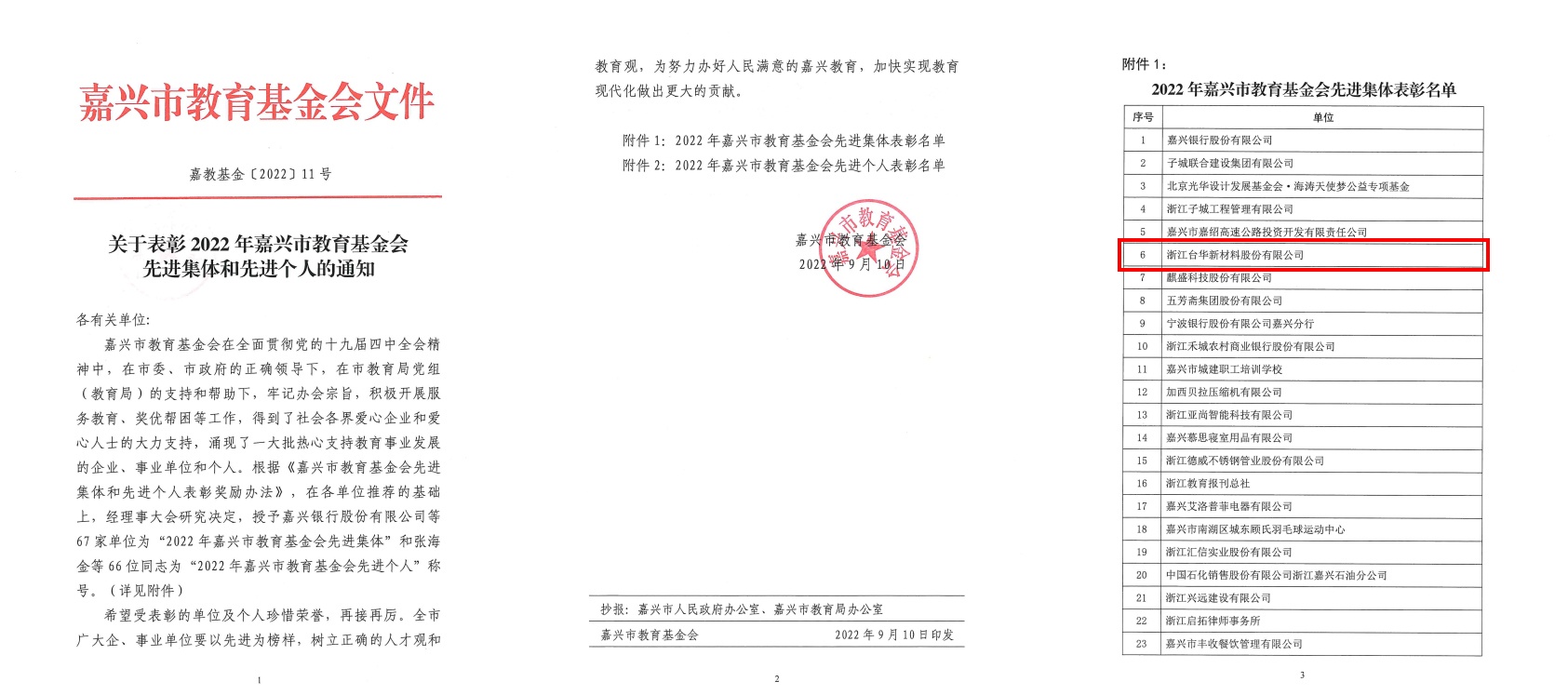 2016年、2021年臺(tái)華分別和嘉興市教育基金會(huì)簽訂捐贈(zèng)協(xié)議100萬(wàn)元,用于獎(jiǎng)勵(lì)當(dāng)?shù)刂行W(xué)德智體美勞全面發(fā)展的優(yōu)秀學(xué)生